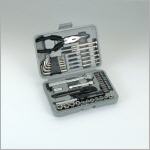 Kleiner Werkzeugkasten in grau. Jegliche Schraubenzieher, eine mittelfeine Zange, ein scharfer Cutter, die Ausrüstung, die einen für alles wappnet.